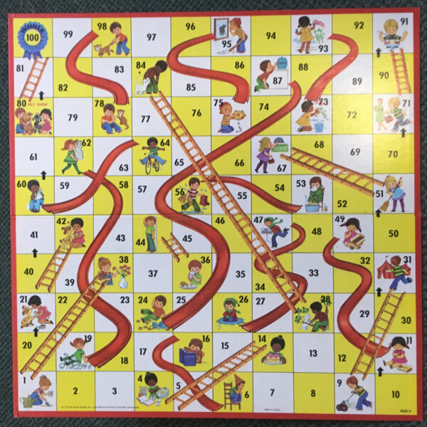 In 1943, Milton Bradley released a secular version of the game, which replaces the snakes with more child-friendly slides, the “chutes.” One progresses on the board by the number of spaces dictated by the spinner, and, when lucky, lands on a ladder to climb or, if unlucky, a chute and slides a little or a long way back. You complete the game by avoiding the chutes while climbing the board and the ladders to the end.